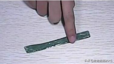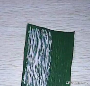 5、现在我们开始做花叶子,去两张长方形的绿色皱纹纸,对折。在皱纹纸的一半边上均匀的涂上白胶,再在涂上白胶的那一半边中间放上一个细铁丝,铁丝的长度长于纸张,把另一边盖上,压住铁丝,以铁丝为中心轴对折,再用剪刀剪出叶子的形状。做两片叶子。