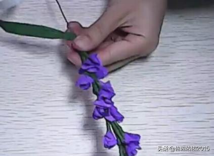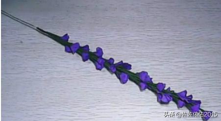6、再把叶子固定在花束上去,因为叶子里面有铁丝在,所以可以根据自己喜欢的形状折成叶子的形状。这样一支花束就做成功了,多做几支花束,就可以并成一束美丽的薰衣草。