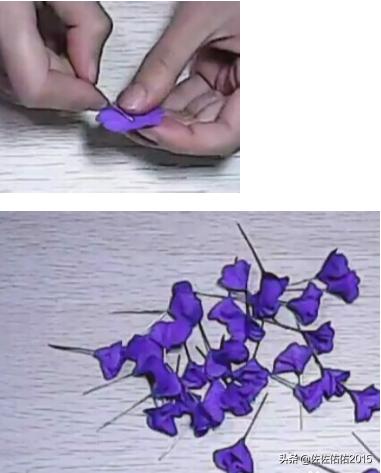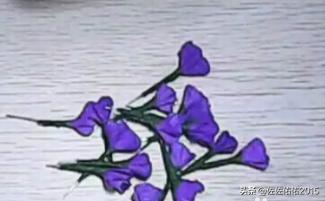 1、准备36个正方形的紫色皱纹纸,这样可以做一支薰衣草。斜着对折,对折3次,用剪刀剪出雨滴的形状,中间剪出一个小孔,展开就变成一个八个花瓣的花,在小孔上贴上双面胶。做完全部的。