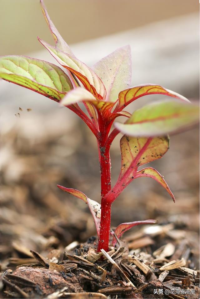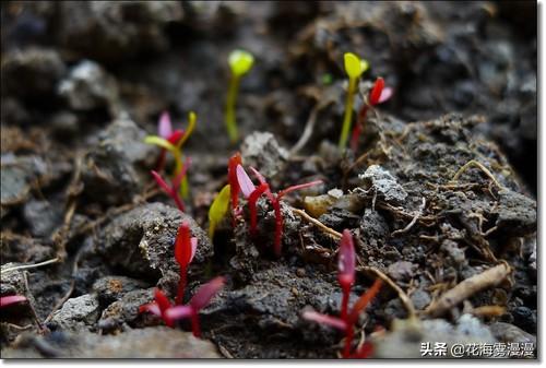 幼苗青黄色的叶子,红色脉路,根茎也是红色