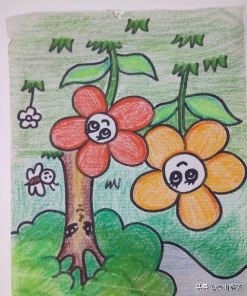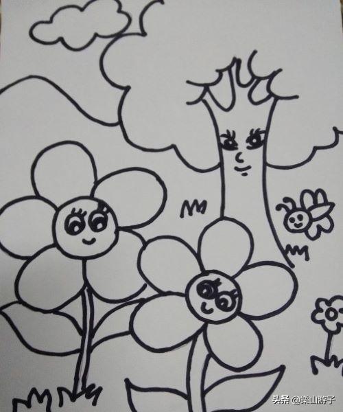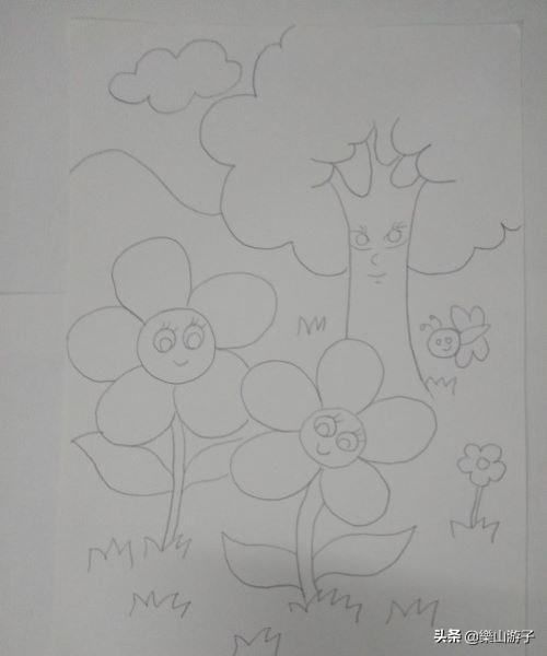 其次,找好大树和花朵的位置,开始作画,把握好花朵的大小以及它们的表情,,添画上背景小花小草蜜蜂。