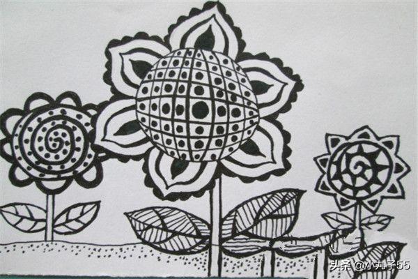 5.用点、线的方法进一步刻画叶子,旁边两颗向日葵可以刻画成自己喜欢的样子。完成线描。