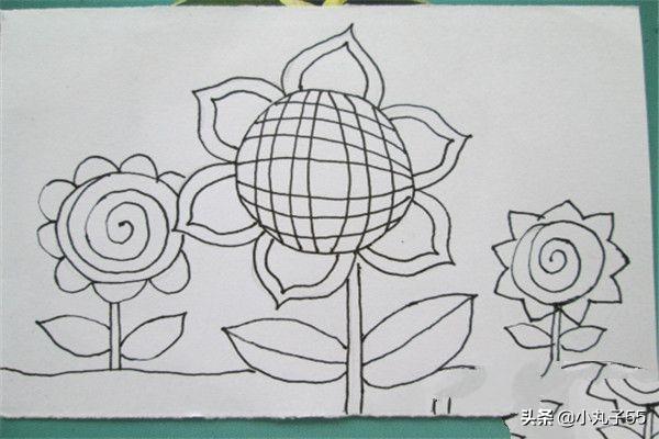 5、用点、线的方法进一步刻画叶子,旁边两颗向日葵可以刻画成自己喜欢的样子。完成线描。