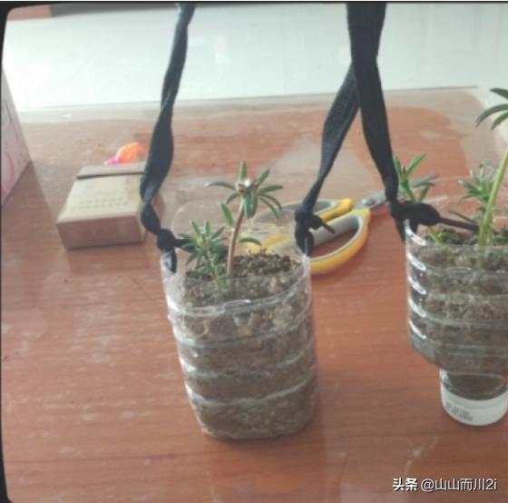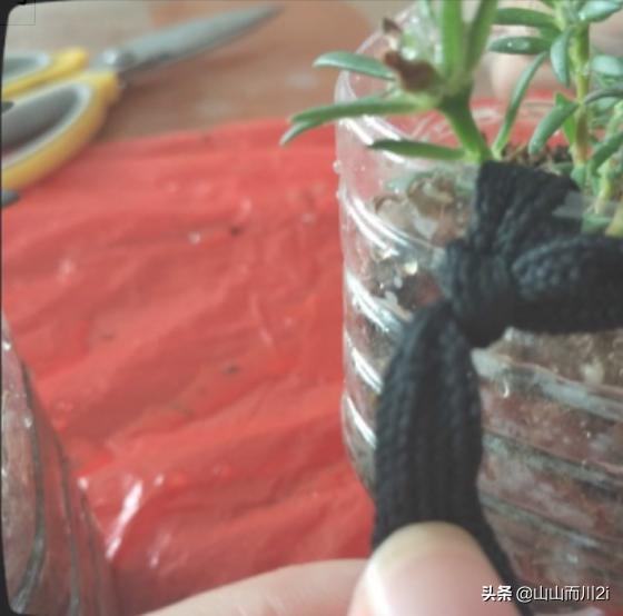7、步骤七:将盆栽悬挂。打好结了以后就可以选择一个阳光比较充足的地方,然后把鞋带绑上去了,因为太阳花是比较喜欢吸收太阳光的,所以悬挂的时候就选择一个有阳光的地方是最好的。